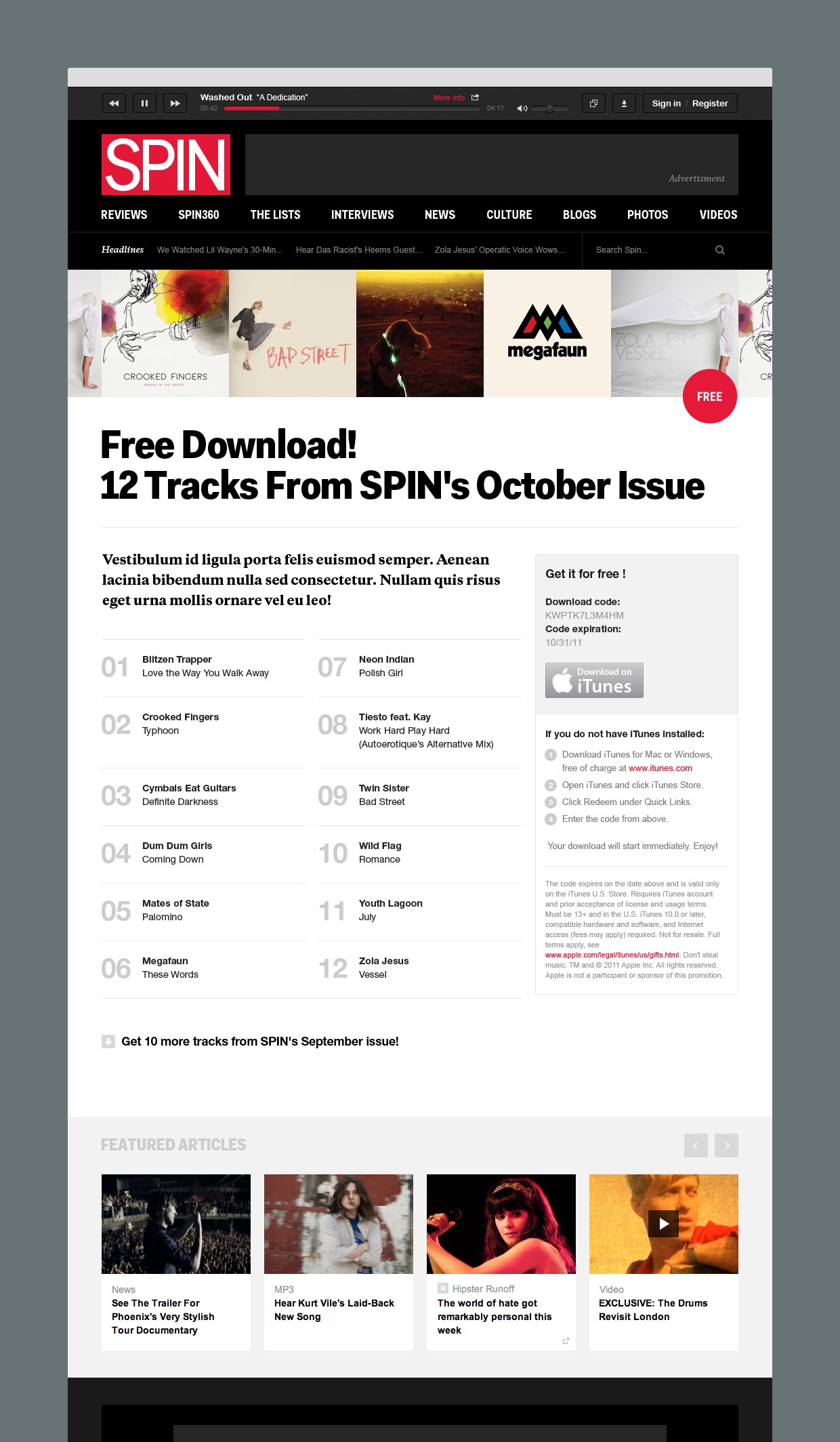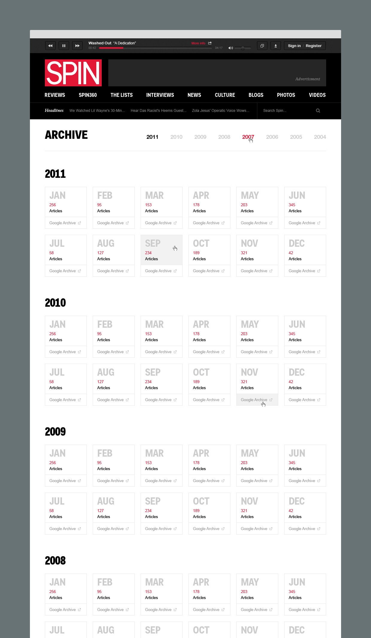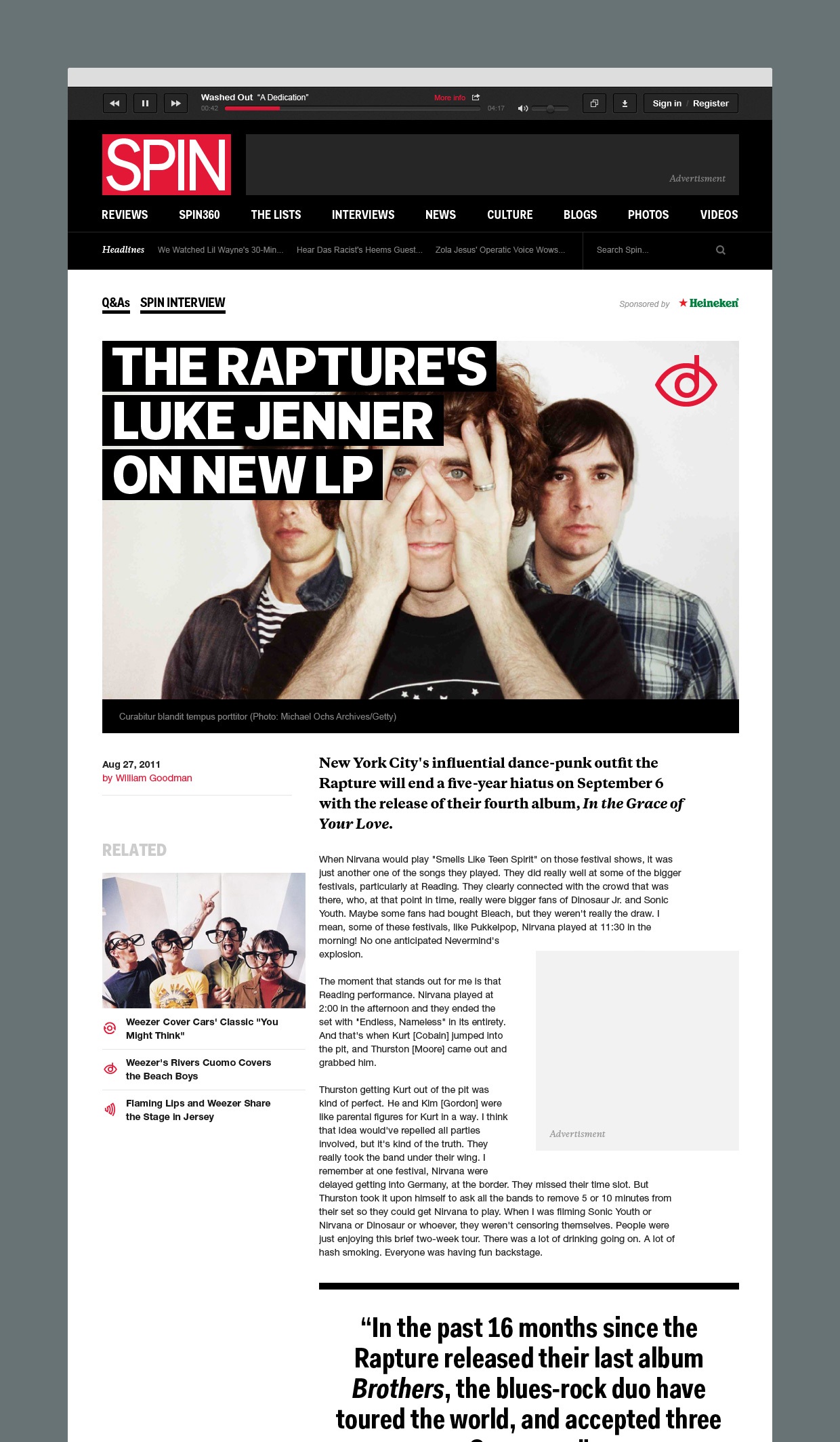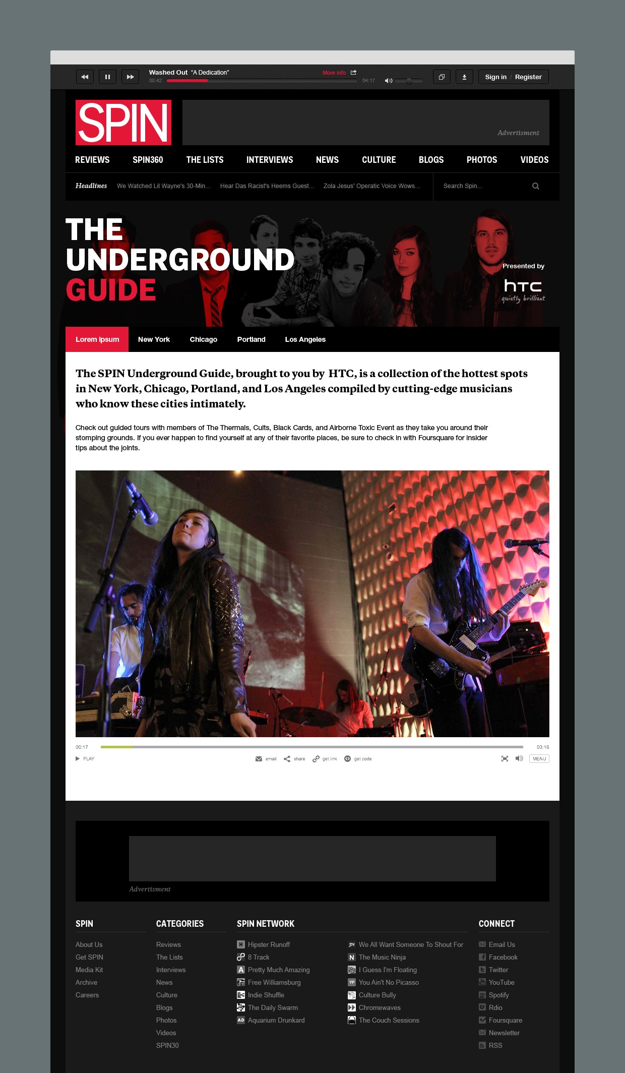 I seconded Art Director David Lamothe in the redesign of the Spin music magazine website.